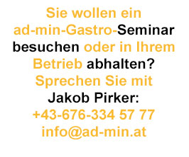 ad-min Jakob Pirker hat sich auf die steuerliche und buchhalterische Betreuung von Gastronomiebetrieben spezialisiert. (Siehe auch unsere Gastro-Registrierkassensoftware.) Wiederkehrende Fragestellungen haben ihn dazu veranlasst, die wichtigsten Inhalte für die erfolgreiche Betriebsführung zusammenzustellen und als Spezialseminar anzubieten: lnformation in offener, ungezwungener Atmosphäre, beginnend mit einem gemeinsamen Essen in ausgewählten Gastrobetrieben.